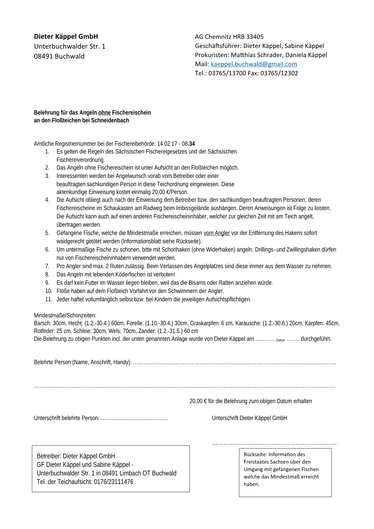 Infoblatt des sächs. Landesamtes für Umwelt über den waidgerechten Umgang mit Fischen durch Personen ohne Fischereischein.